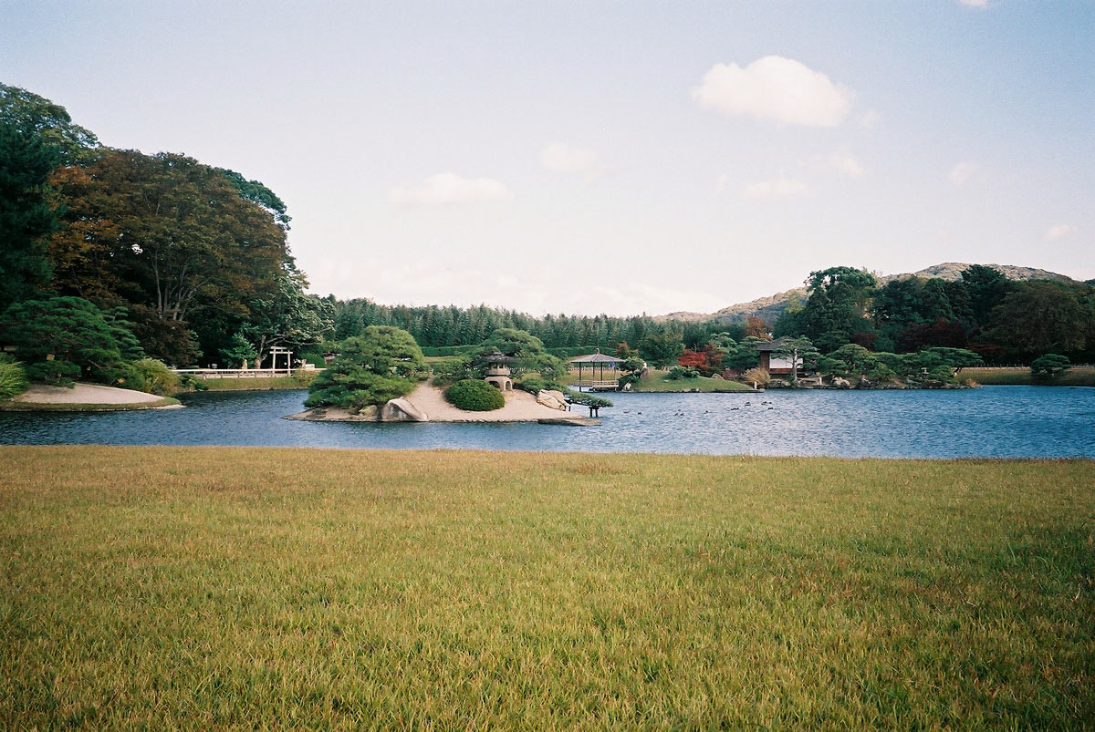 園内は広々とした空間が広がっています。園の中心に小高い唯心山と呼ばれる築山があります。展望台から園内を眺望できます。隣接する沢の池は園内で一番大きな池で中の島・御野島・砂利島が点在しています。池の水面に景色が映りとても綺麗です。